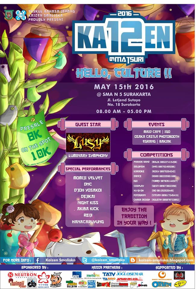 SMA Negeri 5 Surakarta meiliki Ekstra Kulikuler Bahasa Jepang yang di kenal sebagai "Kaizen" yang di tahun 2016 kembali mengadakan agenda tahunan mereka yaitu Kaizen No Matsuri dan di tahun ini sudah yang ke 12. Acara kebudayaan Jepang yang di laksanakan di halaman SMA Negeri 5 Surakarta yang akan di buka untuk umum dalam acara ini. Kaizen Smaliska adalah wujud konsistensi para siswa yang menjadi Kaizen. Dimana event ini merupakan pioner Japansese Festival di Kota Surakarta. Dan tahun ini di 2016 Kaizen mengunsung tema "Hello, Culture !!". Kebudayaan khas Jepang akan mendominasi acara yang diselenggarakan tahun ini.